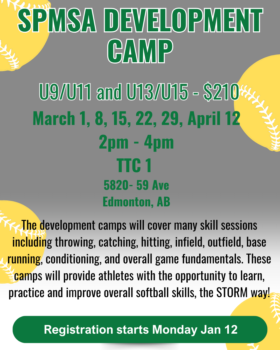 The development camps will cover many skill sessions including throwing, catching, hitting, infield, outfield, base running, conditioning, and overall game fundamentals. These camps will provide athletes with the opportunity to learn, practice and improve overall softball skills, the STORM way!